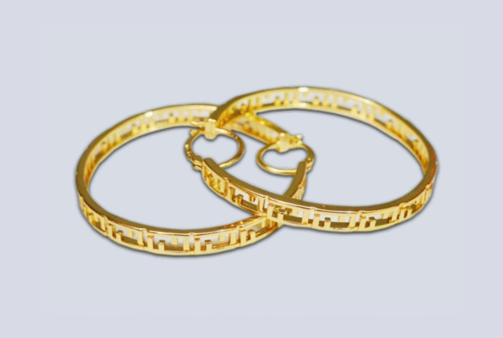 These are a pair of large hoop earrings featuring a gold-tone finish. The design showcases a classic Greek key pattern etched into the surface, giving them a timeless, elegant look. The earrings have a sturdy clasp for secure wear and a polished texture on the inner and outer edges, adding a subtle contrast to the intricate detailing. Perfect for adding a bold, sophisticated touch to any outfit, these hoops are ideal for both casual and formal occasions. Note: The material is not genuine gold, but the appearance mimics the luxurious aesthetic.