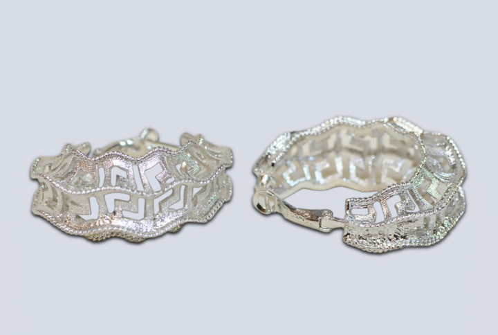 A pair of medium-sized, gold-plated hoop earrings with a shiny finish, featuring a wavy edge and Greek key cutout pattern. The high-quality plating resists peeling, ensuring lasting elegance.